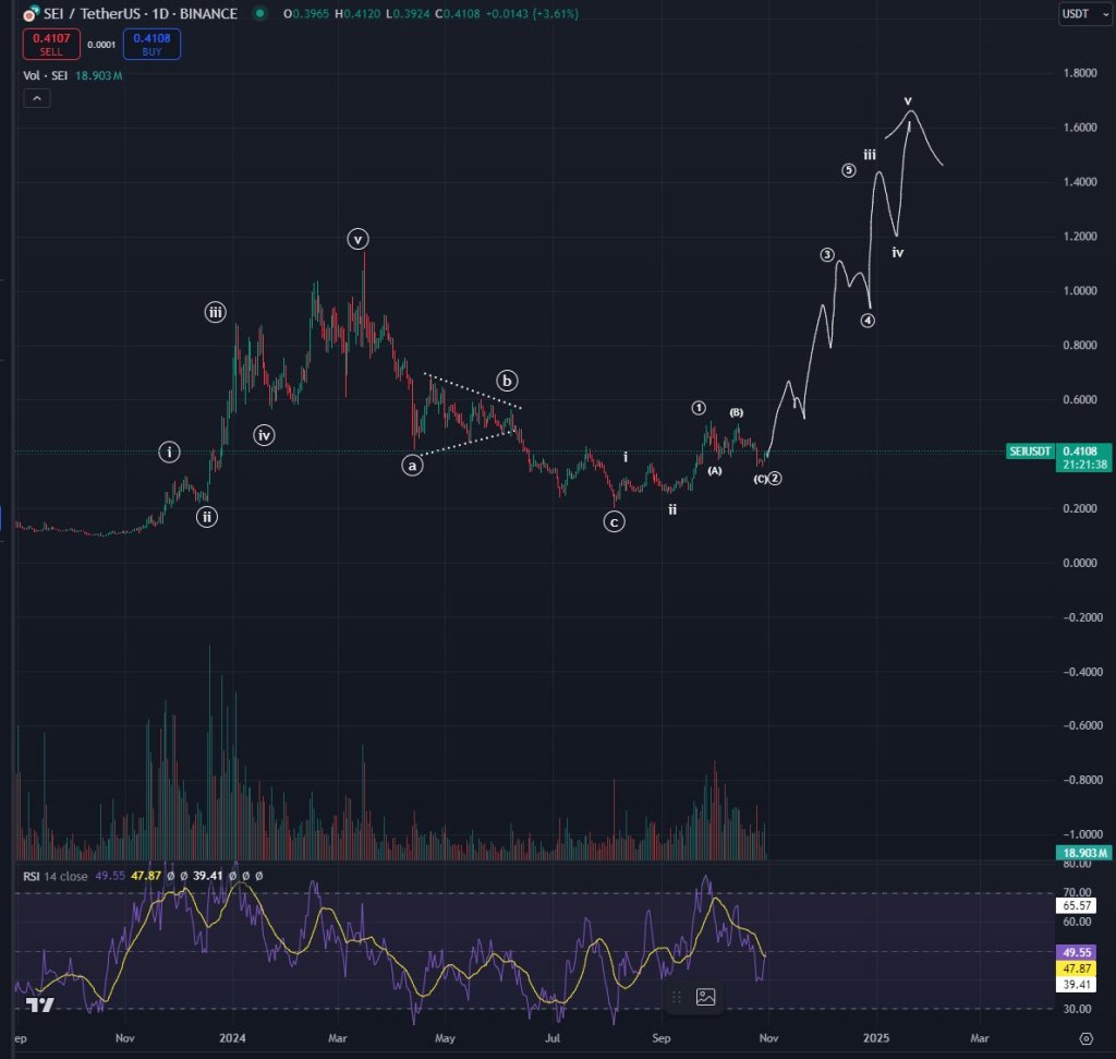 On the social media platform X, the pseudonymous analyst known as Bluntz shares a chart predicting a huge price explosion for the native token for the blockchain project Sei (SEI).