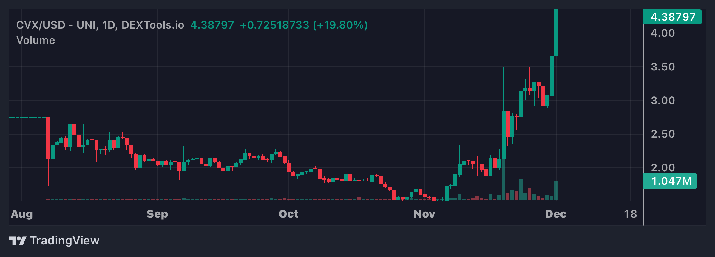 CVX introduced a burn mechanism to reduce supply and increase token scarcity. It recently collaborated with Balancer to extend liquidity optimisation beyond Curve, and its user base grew by 15% over the past quarter due to DeFi’s rising popularity. It collaborates with f(x) Protocol, Yearn Finance and Aave to provide strategies for maximising returns and exploring lending and borrowing opportunities for its holders. CVX’s low supply, strong market momentum, and increasing utility make it an exciting investment opportunity.