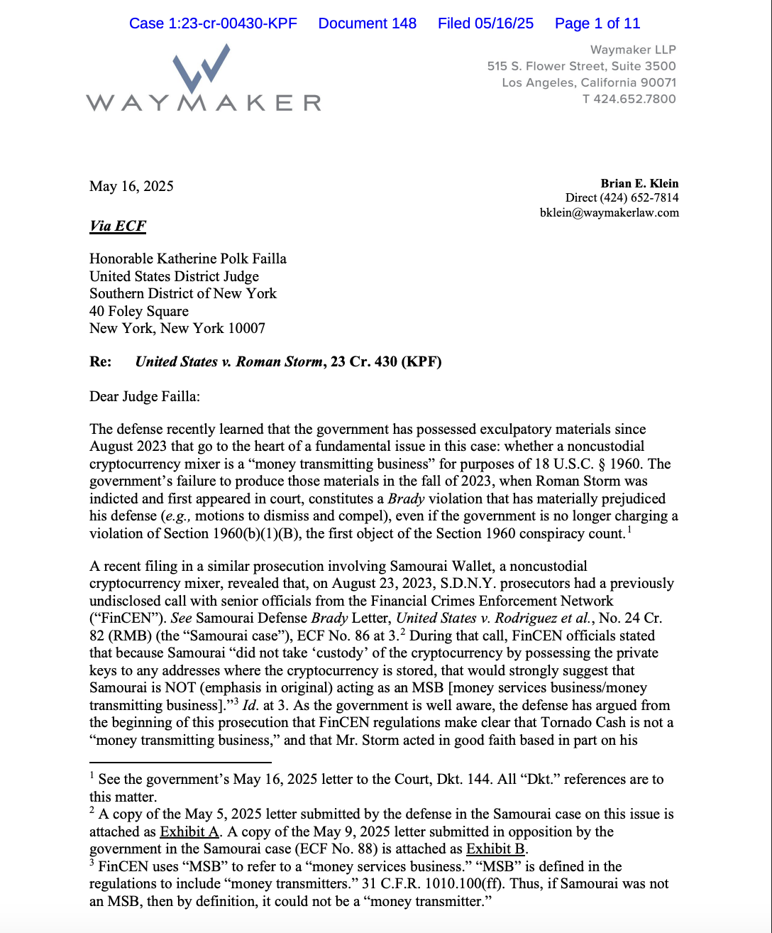 According to a May 16 letter from Storm’s attorneys to Judge Katherine Polk Failla, the FinCEN documents show that non-custodial crypto mixers do not fall under the legal definition of a “money transmitting business” and that prosecutors have known this since at least 2023.