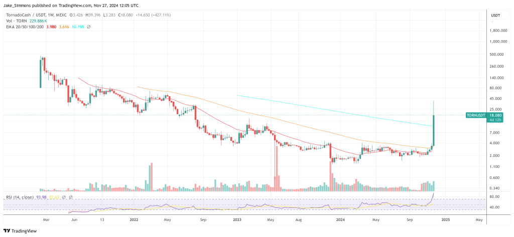 At press time, the Tornado Cash token (TORN) traded at $18.08, up 415% in the last 24 hours.