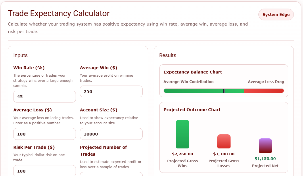Use our Trade Expectancy Calculator to measure system edge, compare win rate with average win and loss, and estimate whether your trading strategy is profitable over time.