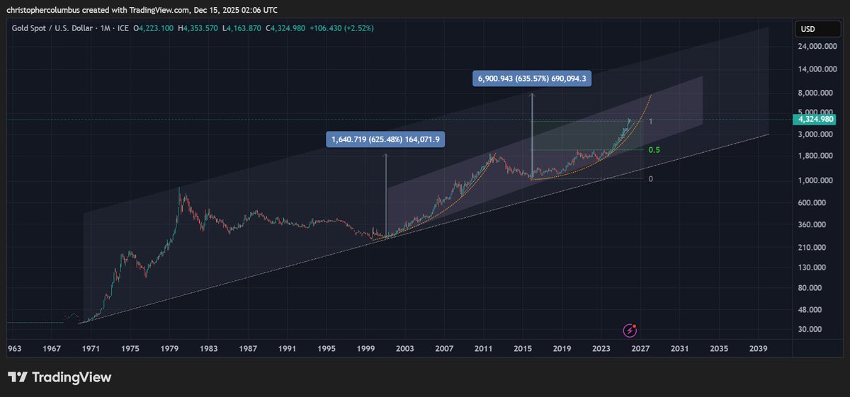 Crypto market analyst Dave the Wave tells his 152,000 followers on X that a Fibonacci-based price target for gold priced in U.S. dollars has been reached and that the metal remains capable of advancing toward $8000.