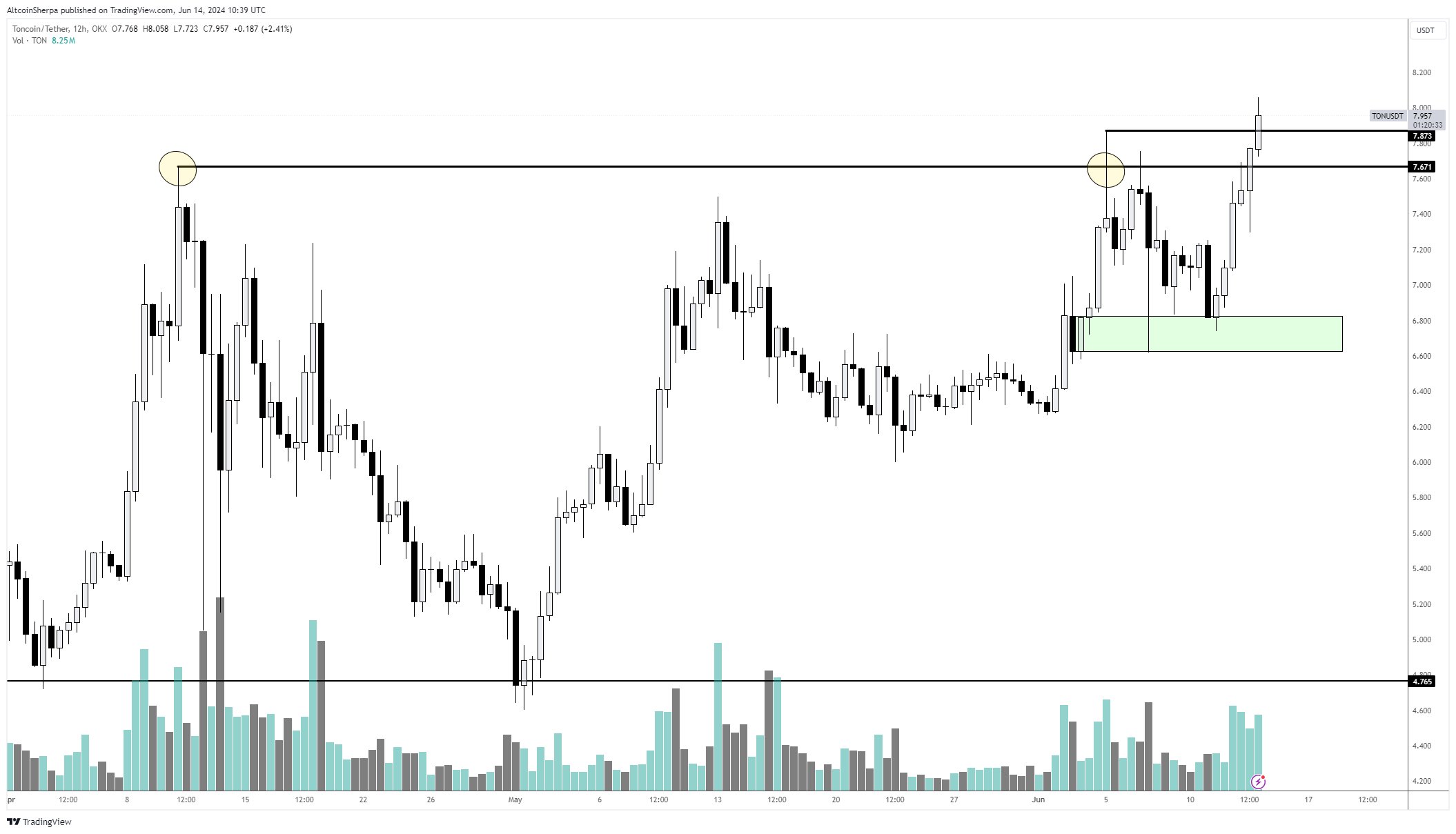 The trader pseudonymously known as Altcoin Sherpa tells his 217,300 followers on the social media platform X that the native token of layer-1 blockchain Toncoin (TON) is in a strong uptrend after hitting an all-time high (ATH) of $8.25 on June 14th.