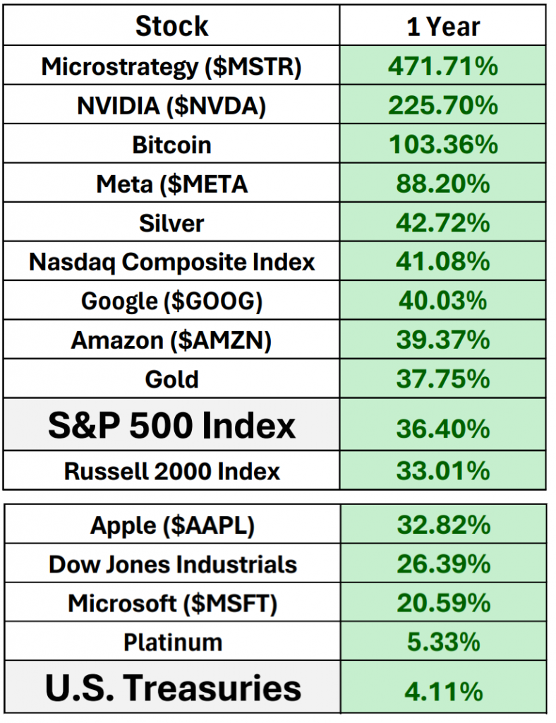 What I find fascinating about the current environment that we are in is that Gold and Silver are outperforming the major stock market indexes. The Magnificent 7 and Microstrategy are lifting the S&P 500 Index and this is the first positive performance Treasuries have had in the last 4 years.