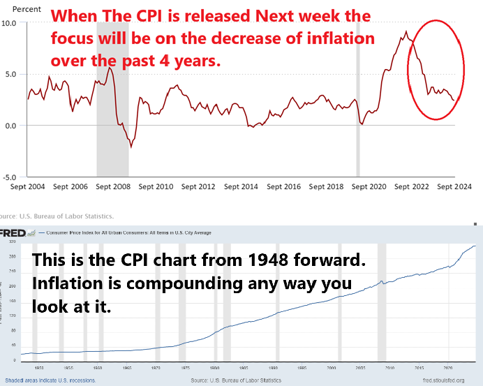 Next week when the CPI report is released you will be bombarded with an intense focus of how much inflation has improved in the last 4 years. Understanding the toxic nature of inflation is crucial due to its compounding effects, which systematically erodes purchasing power — a loss that is essentially irreversible. When inflation pushes prices up, they seldom revert to previous levels; instead, the pace of increase might simply decelerate. This subtle yet persistent rise is deceptive. For instance, consider an item priced at $1. If inflation causes the price to rise to $1.05 one year, then $1.09 the next, followed by $1.12 and $1.14 in subsequent years, this incremental hike represents a continuous erosion of purchasing power. Politicians may tout this slowing pace as a victory in “battling inflation,” but this is often a misleading portrayal, minimizing the ongoing impact of inflation. It’s a charade that obscures the true economic burden placed on consumers, making it imperative to scrutinize why prices are escalating in the first place. This is why a deep understanding of the causes and mechanics of inflation is essential, rather than relying on the often-polluted economic reporting that paints a rosier picture than reality justifies.