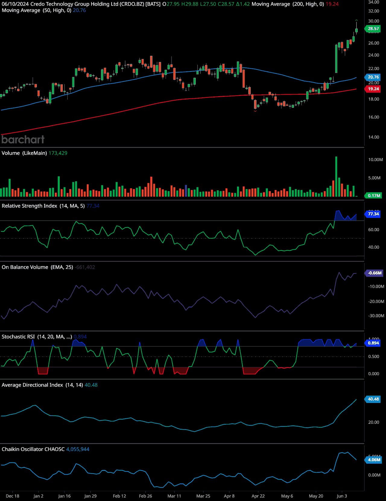 - The stock is in a strong upward trend, supported by high volume and confirmed by both OBVThe On Balance Volume indicator (OBV) is a technical analysis tool used to measure the flow of money into and out of a security over a specified period of time. It is a cumulative … More and ADXThe Average Directional Index (ADX) stands as a cornerstone indicator in the toolkit of technical traders, offering insights into the strength of market trends. Developed by Welles… More.