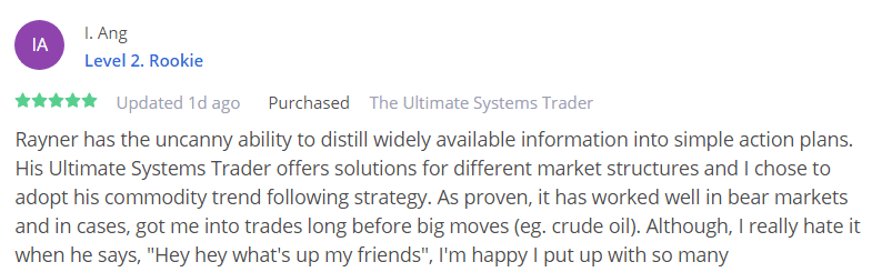 Here’s what one of my students, I Ang (from The Ultimate Systems Trader), has to say about Trend Following…