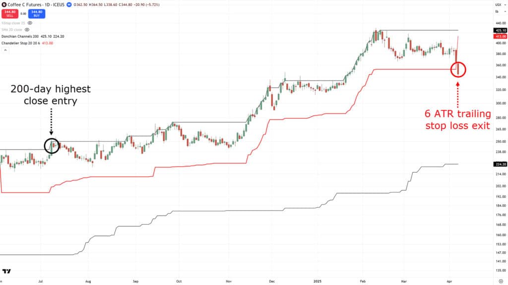 On July 9, 2024, Coffee made the highest close over the last 200 days (as shown on the Donchian Channel) and gave you an entry trigger to go long.