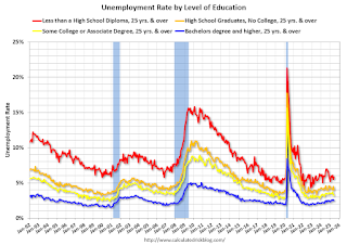 The first graph shows the unemployment rate by four levels of education (all groups are 25 years and older) through June 2025. Note: This is an update to a post from several years ago.