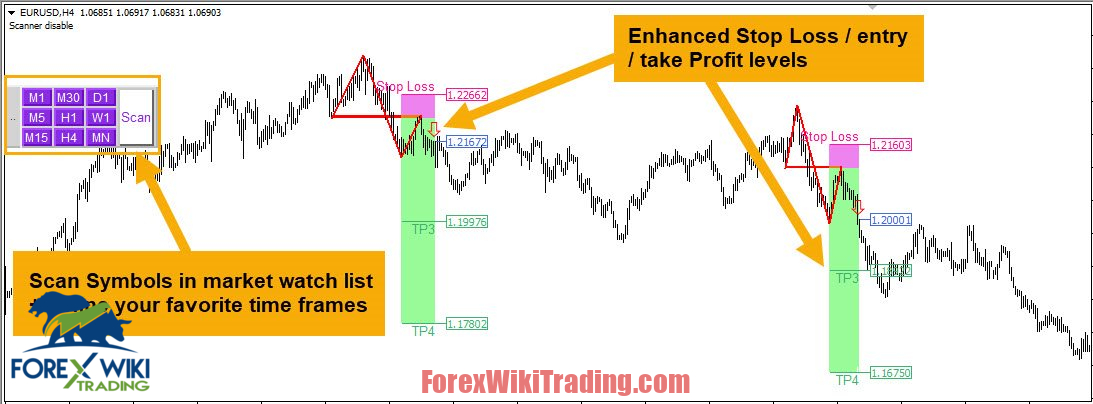 The scanner highlights potential trade opportunities, marking entry points, stop-loss, and take-profit levels on the chart.