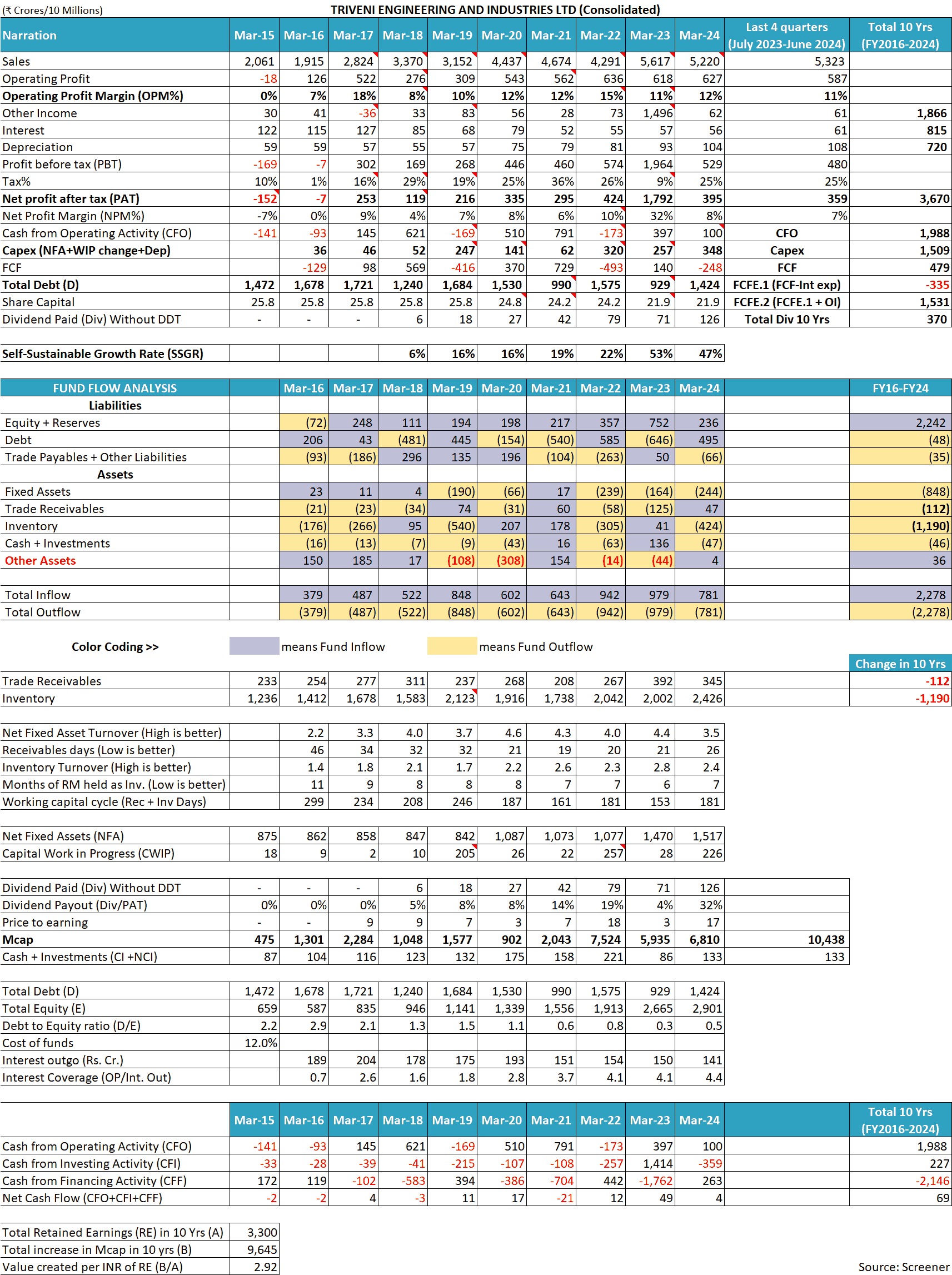 Therefore, in our analysis of Triveni Engineering and Industries Ltd, we have analysed consolidated financials for the last 10 years (FY20115-FY2024).