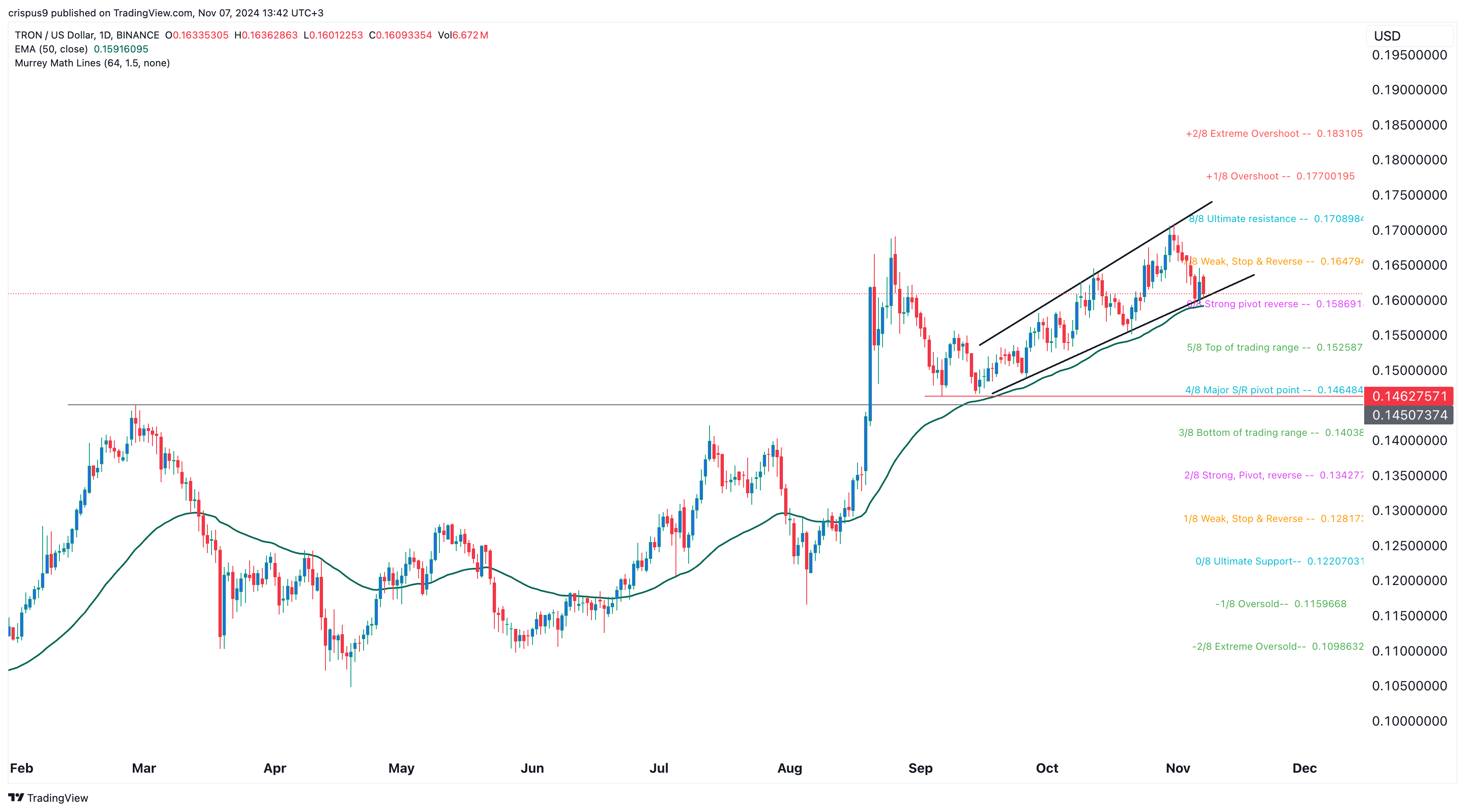 Therefore, Tron bulls will need to ensure that the Tron price remains above the lower side of this pattern in the near term. This lower side also coincides with the strong pivot reverse point of the Murrey Math Lines and the 50-day Exponential Moving Average (EMA).