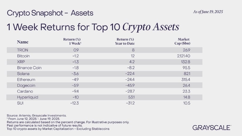TRON leads Grayscale’s weekly performance with a +0.9% gain, standing out as the only top 10 crypto in the green. Source: Grayscale via X