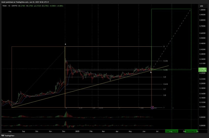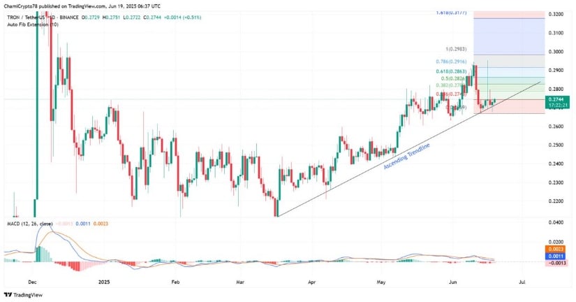 TRON’s price action has been one of the cleanest structures in the entire market. As shared by crypto analyst niggyxx, TRX TRON price recently bounced cleanly off the 0.618 Fibonacci retracement zone near $0.274. That level, often seen as a textbook bullish retracement, has sparked renewed upside interest. Even more notable is how TRX continues to move along its ascending support line, signalling a bullish trend.