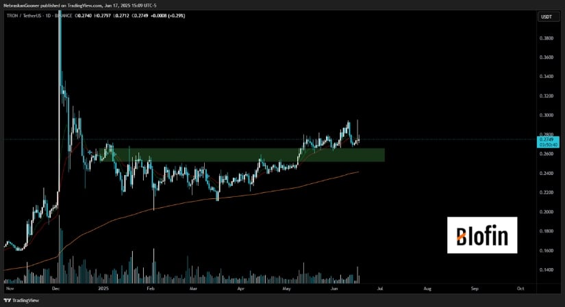 TRX holds above key breakout support with healthy volume and a supportive 200-day MA, keeping the path open toward $0.30–$0.32. Source: Nebraskangooner via X