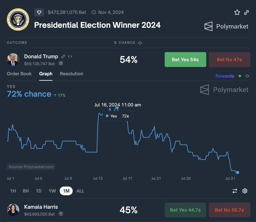 This debate comes amid a decline in Trump’s chances of winning the presidential election, which have dropped to 54% from a peak of 72% in July. His main rival, Vice President Kamala Harris, has gained traction and recently secured her first major crypto executive endorsement from Uphold’s co-founder, J.P. Theriot.