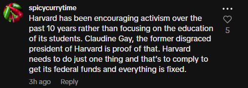 “Harvard has been encouraging activism over the past 10 years rather than focusing on the education of its students. Claudine Gay, the former disgraced president of Harvard is proof of that. Harvard needs to do just one thing and that’s to comply to get its federal funds and everything is fixed.”