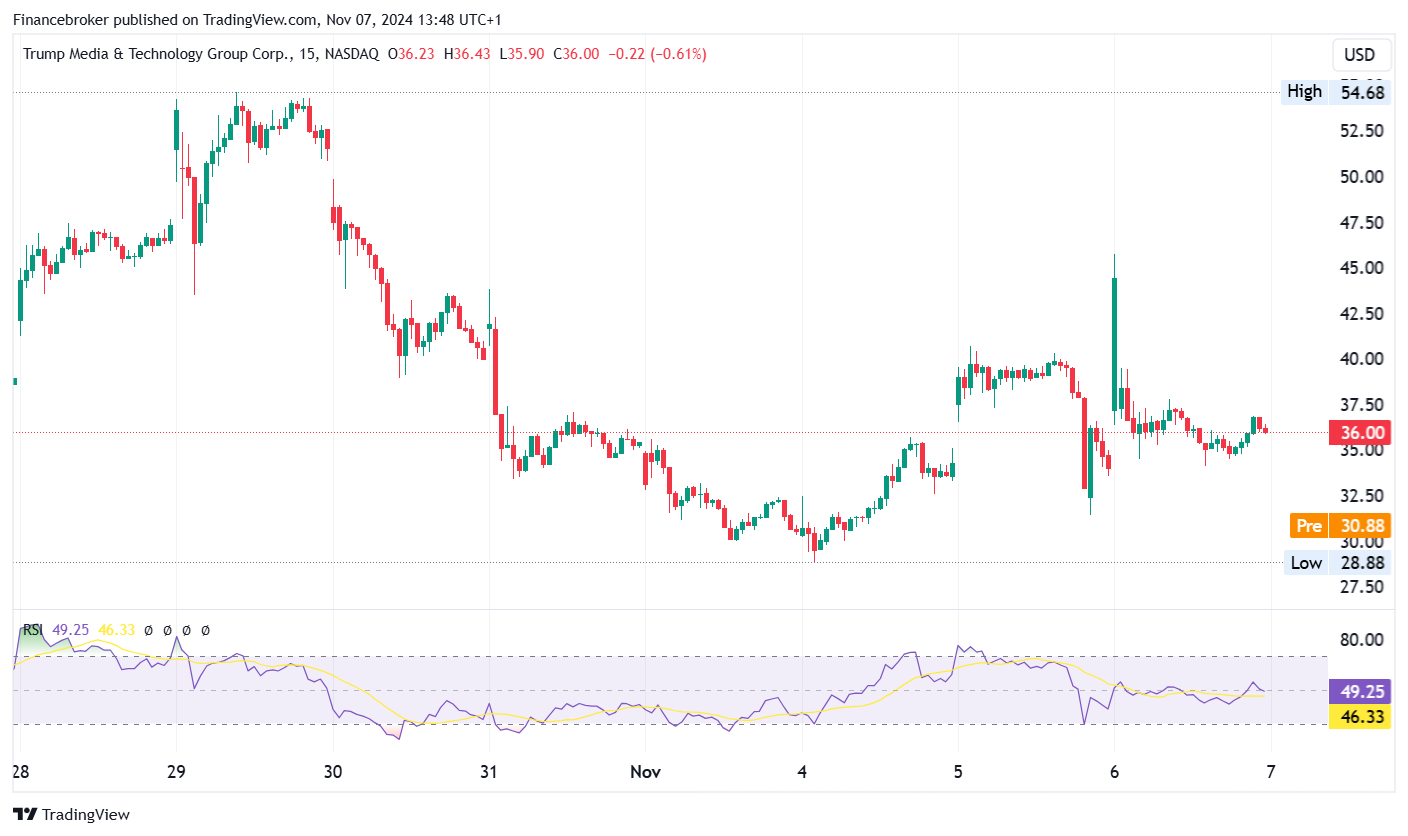 Trump Media & Technology Group (DJT) stock rose by as much as 25% on Wednesday after Donald Trump’s victory over Kamala Harris in the US presidential election had been announced. Although the stock experienced significant fluctuations throughout the day, it eventually ended the day positive by approximately 6%, despite a number of trading halts caused by the high levels of activity.
