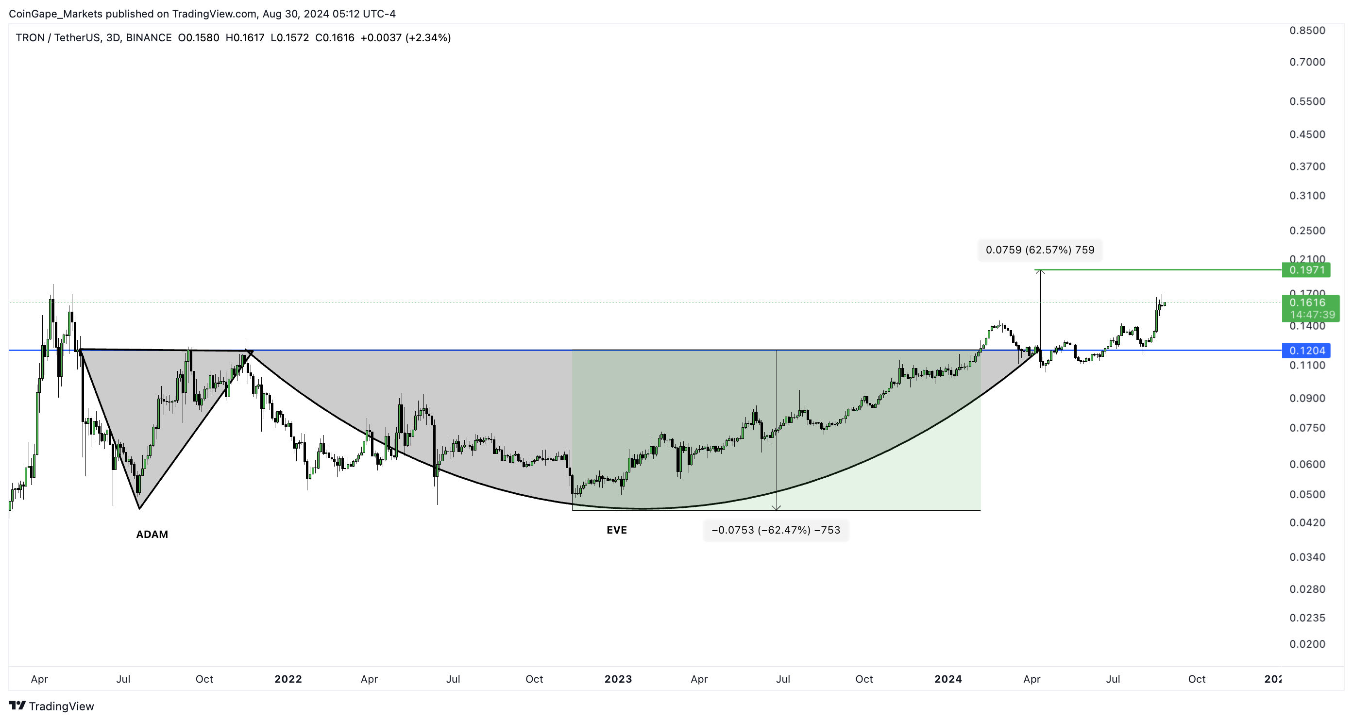 TRON forms an Adam and Even pattern that forecasts a 62% rally in the near term to $0.1971. As mentioned above, TRX could rally much higher if this outlook continues.