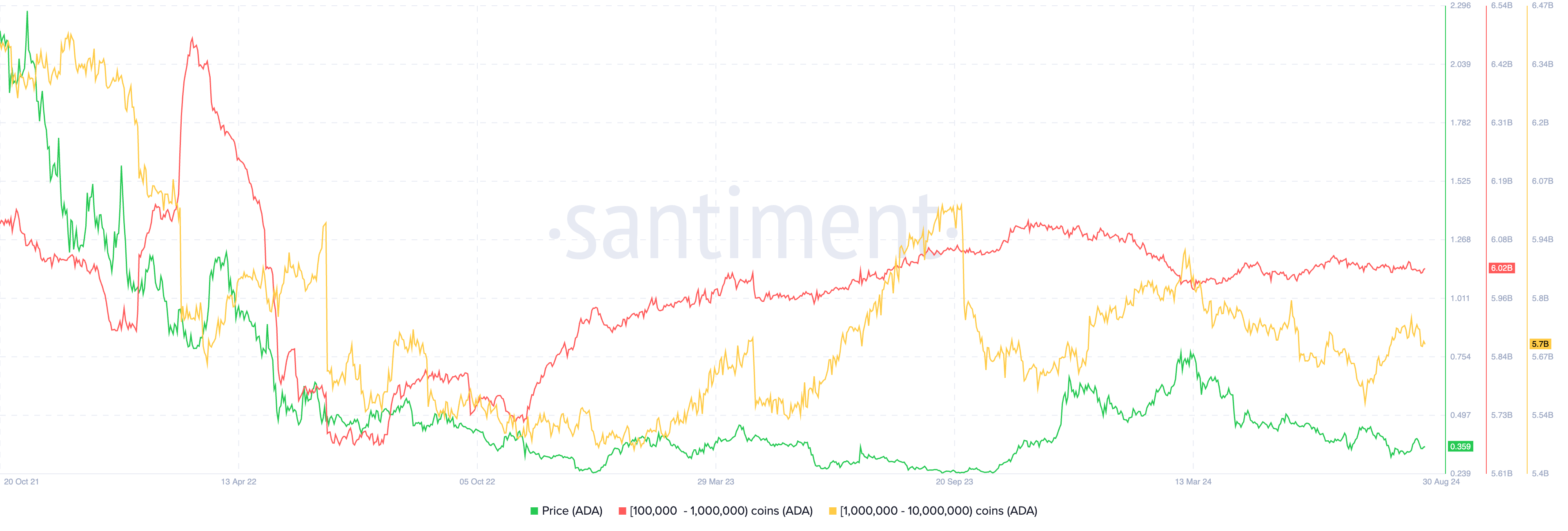Cardano whales have been actively accumulating over the past mid-2022. Wallets holding between 100K to 1M and 1M to 10M ADA have increased their balance from 5.67B and 5.57B to 6.02B and 5.7B, respectively.