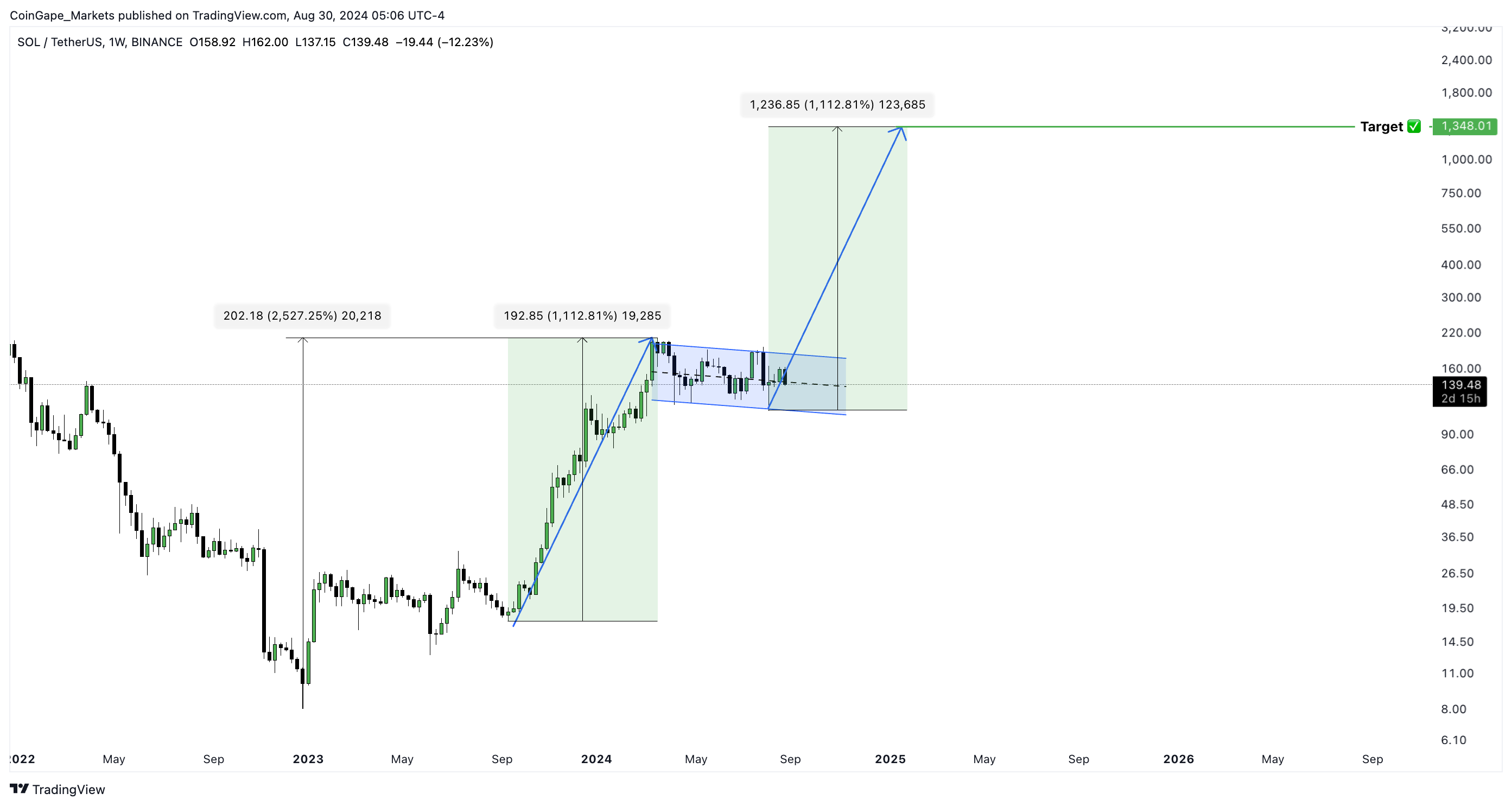 Solana (SOL) is expected to surge by 1127% and reach $1,348 based on the bull flag continuation pattern.