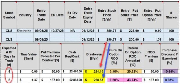 • 9/12/2025: At contract expiration, CLS closed at $241.77, down substantially from the price at trade entry but well above both OTM put strikes