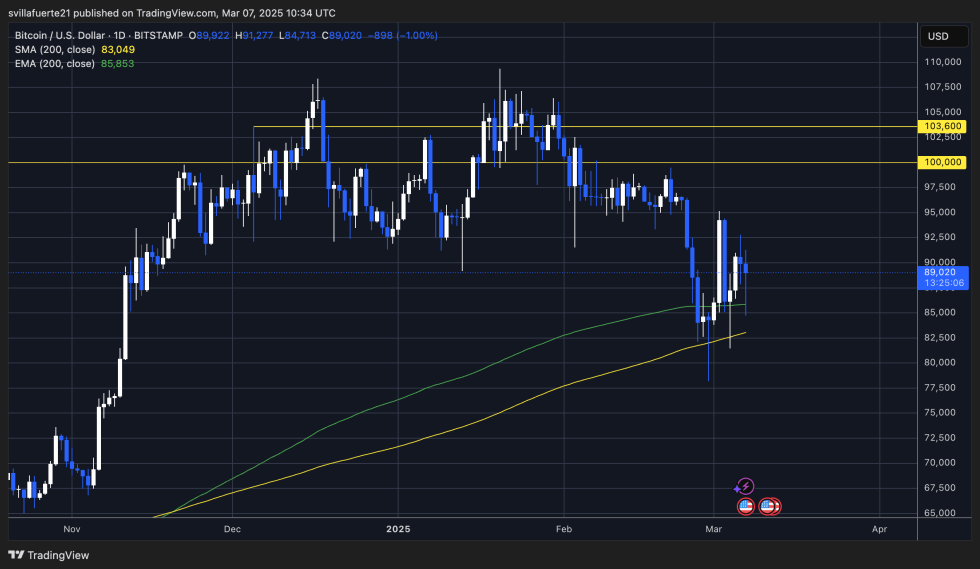 Bitcoin is facing selling pressure despite positive developments and ongoing market volatility. Since President Trump’s executive order to establish a Strategic Bitcoin Reserve, BTC has struggled to reclaim the $90,000 level, failing to turn it into support. This decline in crypto markets closely mirrors the downtrend in U.S. stock markets, as investors react to fears of a widening global trade war and broader macroeconomic concerns.
