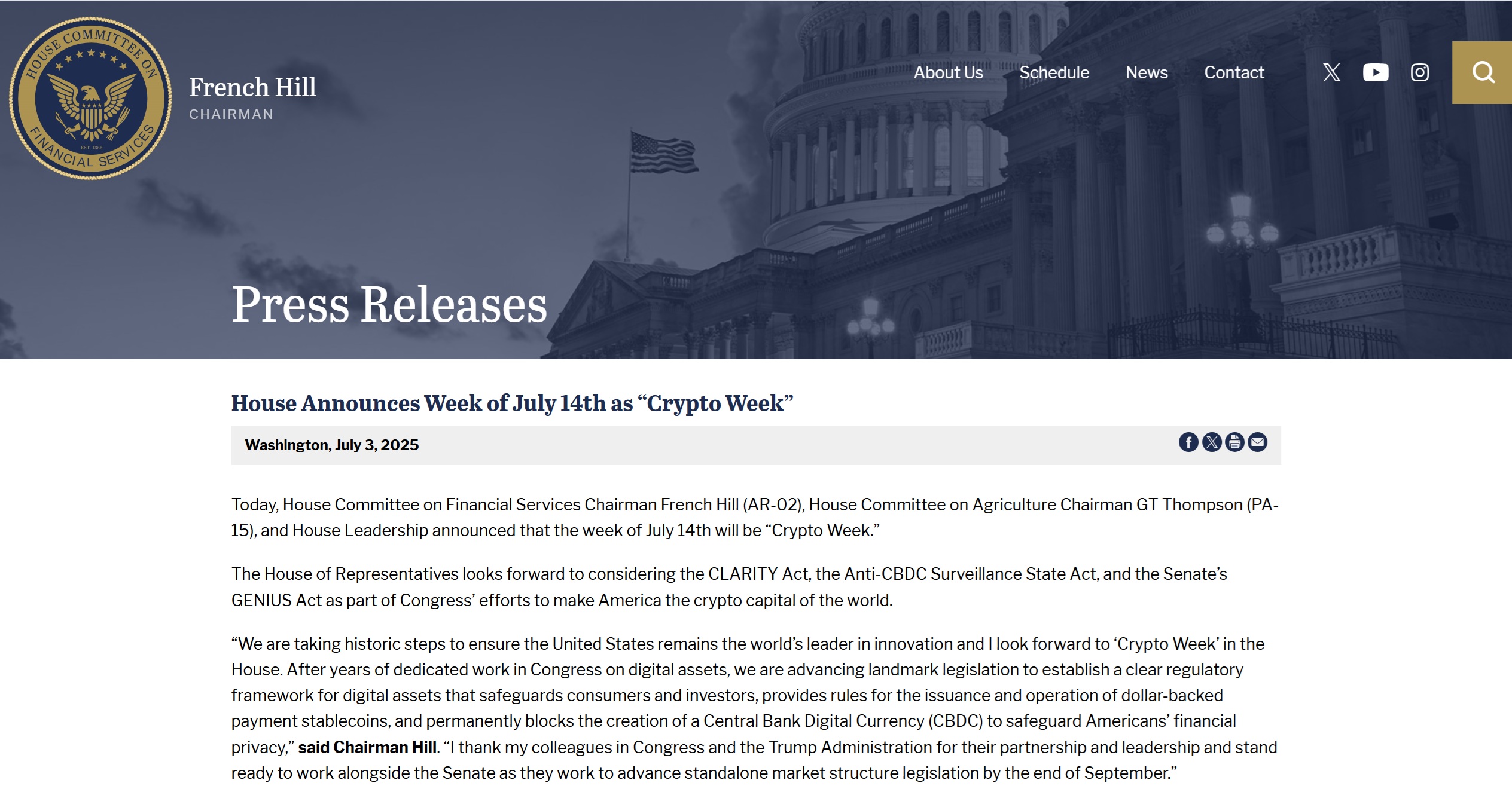 House Financial Services Chairman French Hill called the week an important step in getting overdue crypto regulation in place. He pointed out that the bills are the product of years of work and are meant to bring clarity without stifling innovation.