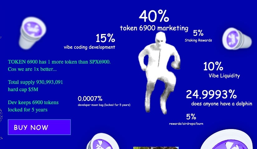 $T6900 draws inspiration from the S&P 500 and SPX6900, reimagining traditional finance through the lens of early-2000s internet humor. It’s designed to compound faster than the S&P did in a century and faster than SPX6900 did in two years.