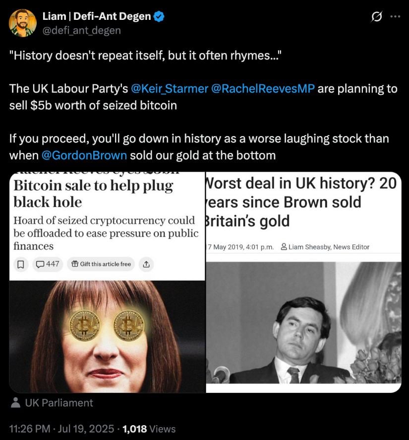 Naturally, the crypto market is nervous. Any big sell-off can rattle prices, especially if it echoes past blunders like the UK’s 1999 gold sale (yes, the one where they sold low and regretted it for decades).