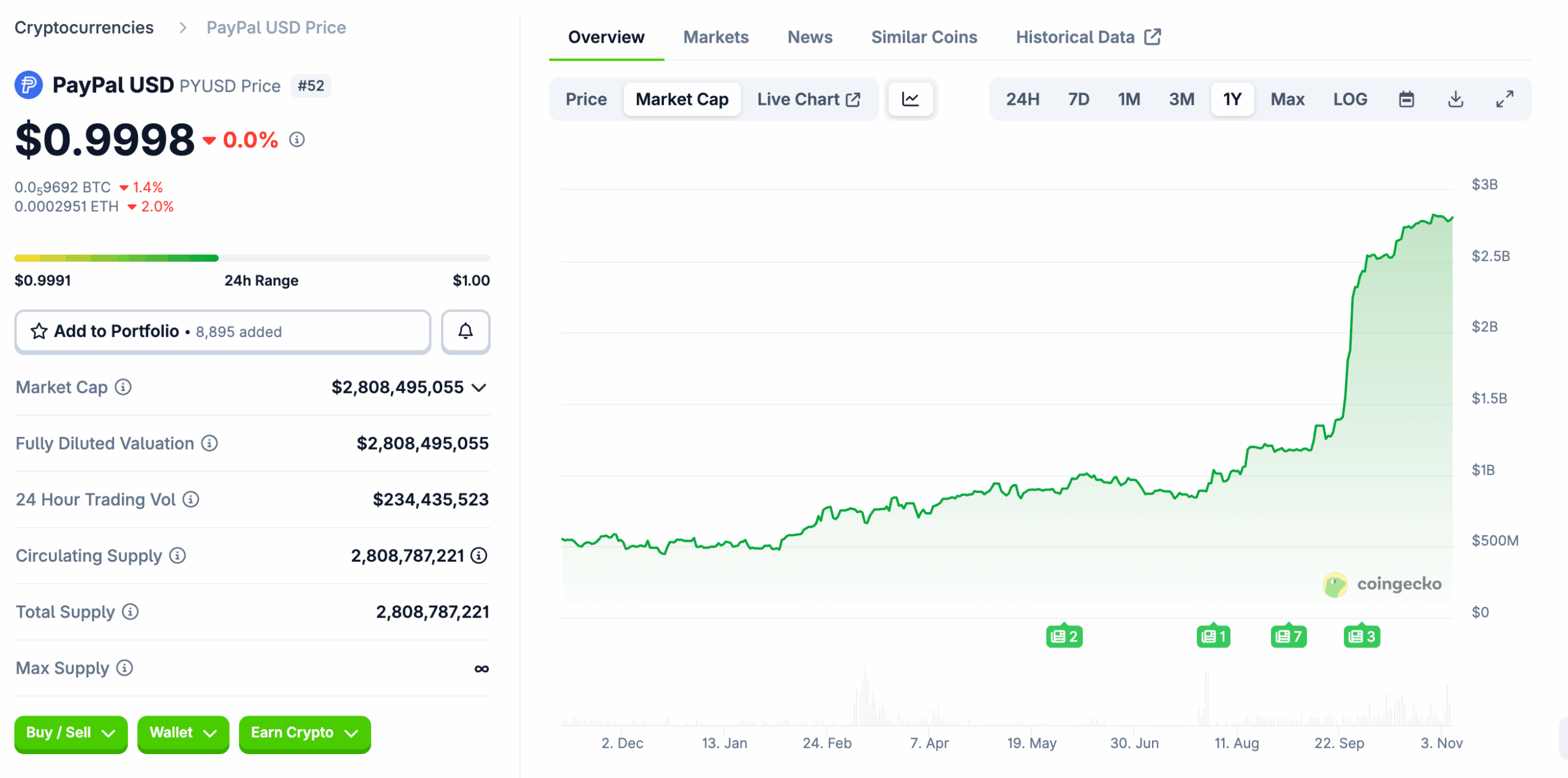 PayPal’s PYUSD stablecoin holds a $2.8 billion market capitalization and has expanded to the Stellar network, targeting 170 countries. The company’s “Pay with Crypto” feature supports over 200,000 merchants that accept digital asset payments via instant stablecoin-to-fiat conversions. Traditional payment providers, including Western Union, are also exploring stablecoin offerings as regulatory clarity improves.