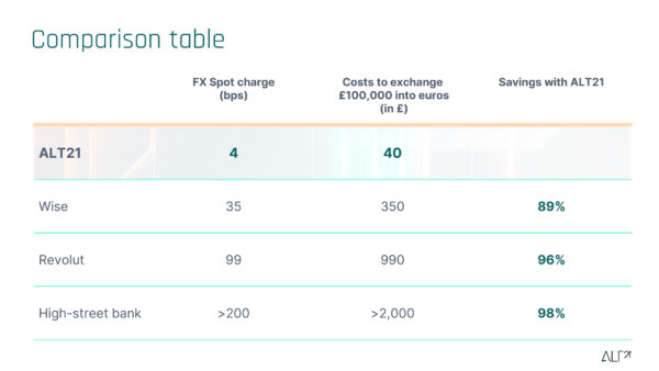 Compared to other alternative providers like Wise, which operates the same currency pair at a cost of 35 basis points[2], ALT21 provides significant savings to businesses, being nearly nine times cheaper, and setting a new standard in financial efficiency.