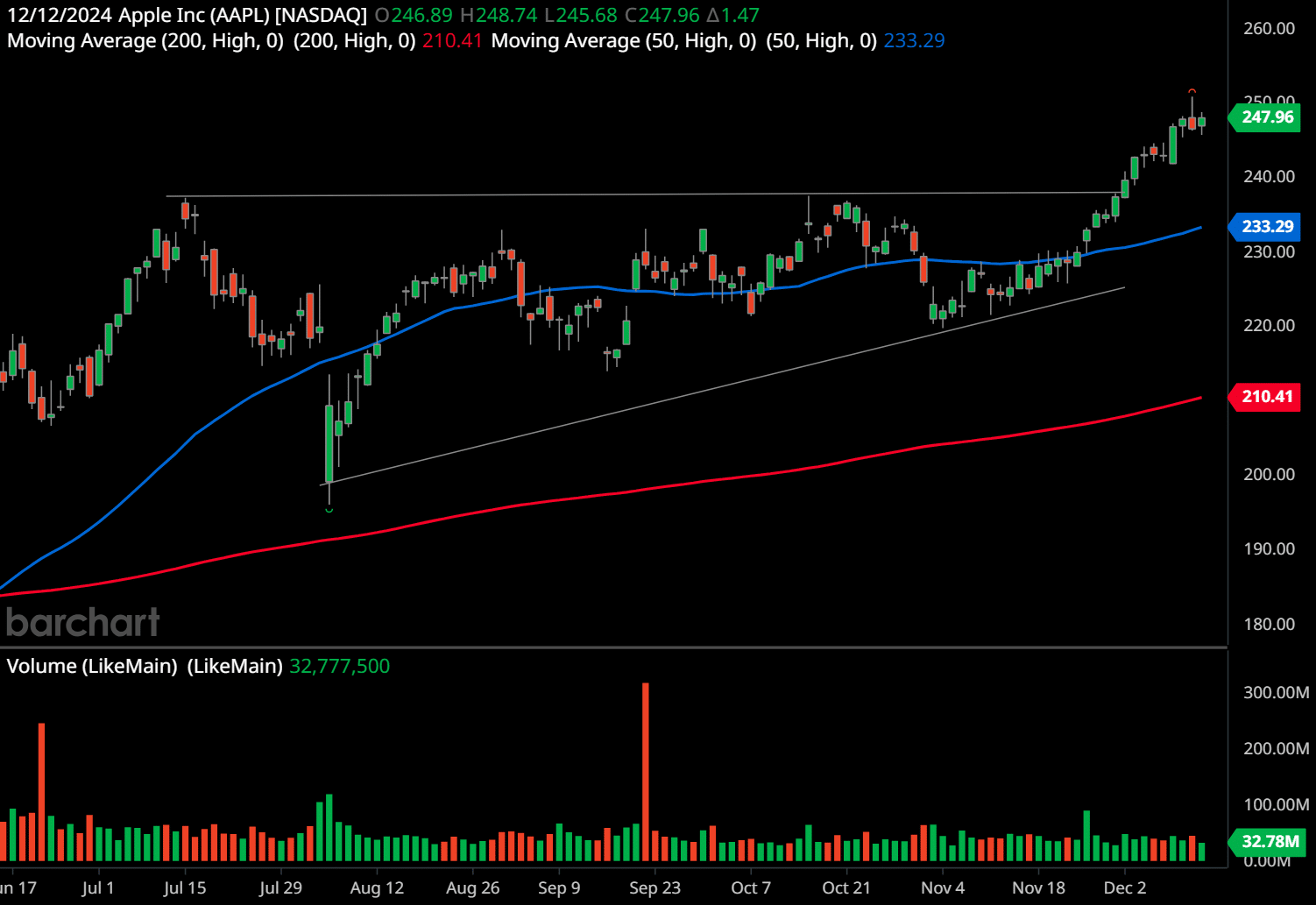 - Example: The MACDThe MACD indicator is essentially a momentum indicator that shows the relationship between two different moving averages of price. The MACD is the difference between the 12-period … shows a bullish divergence as the price approaches the median line of the PitchforkAndrew’s Pitchfork is a popular technical analysis tool used in stock trading to identify potential levels of support and resistance and forecast price movements. It is particularl…, indicating a likely upward breakout.