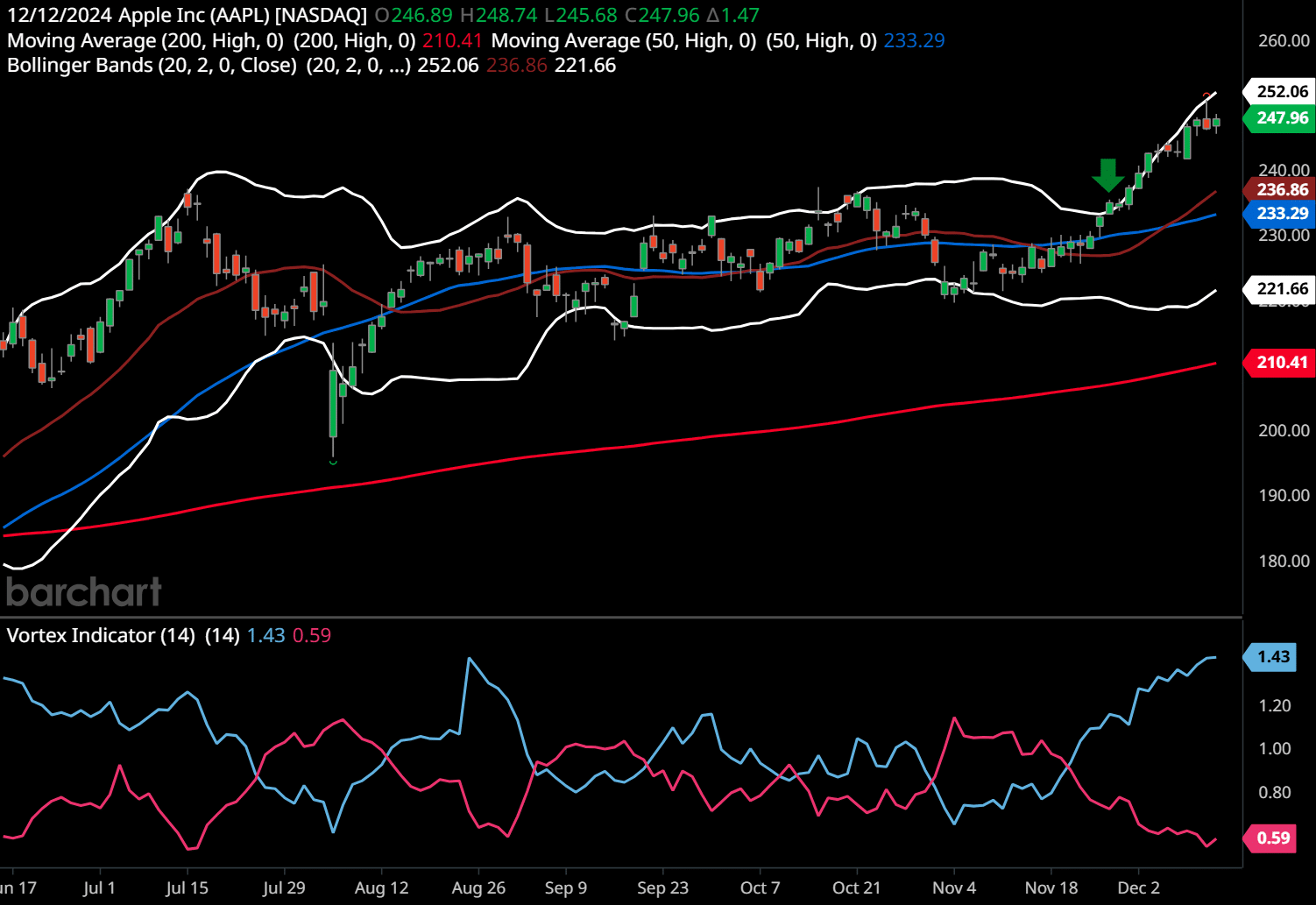 When a stock’s price consistently touches or hovers near the upper Bollinger Band, traders might interpret this as a signal to sell or wait for a correction.
