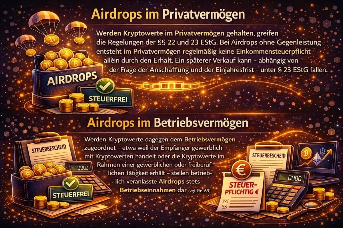 Die steuerliche Behandlung eines Airdrops hängt nicht nur von der Einkunftsart ab, sondern auch davon, ob die Kryptowerte dem Privat- oder Betriebsvermögen zuzuordnen sind.