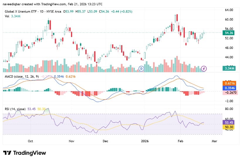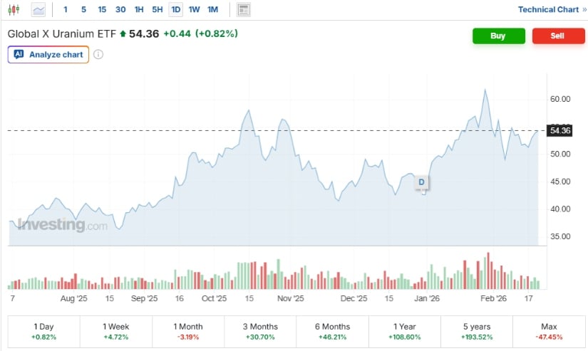 Investing.com: Global X Uranium ETF (URA) is at $54.36, up by 0.82%, following a low, and still records one-year returns of well above $108, which is the persistent momentum in the sector.