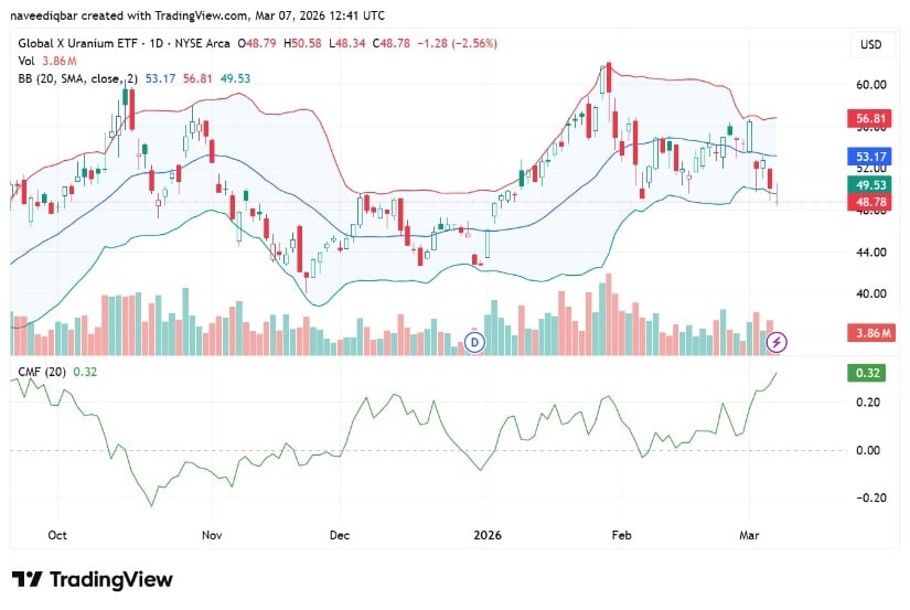 On the other hand, URA goes at $30–$32 midline, under a bearish SMA cross (20/50) because of the December 2024 death cross, bearish engulfing, and low highs holding price in a downtrend channel. Volume screams on red candles, such as dumping in January 2025, and greens are weak, with oscillators in the neutral-oversold range of the possibility of a mean reversion.