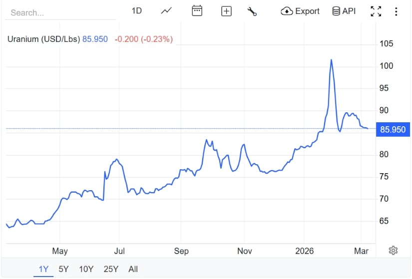 Backwardation of the $86 spot and $88 terms is a warning of tightness in the near future, which is driving miner/ETF pops such as the +25% early-year gain in URA with a wider general downtrend. Projections see $87 at quarter-end and $92.51 at the end of 12 months, which is supported by reactor ramps and a $60b market.