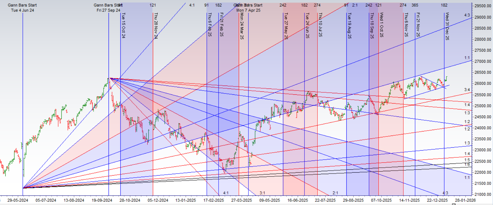 The Bearish Reversal Case: However, a decisive break and failure to maintain the 26,199 level would signal that the bearish power of the Mars cycle is overwhelming the bulls. This would be a major technical failure, inviting a wave of profit booking and targeting a swift decline towards 26,038 and a more significant fall to 25,958.