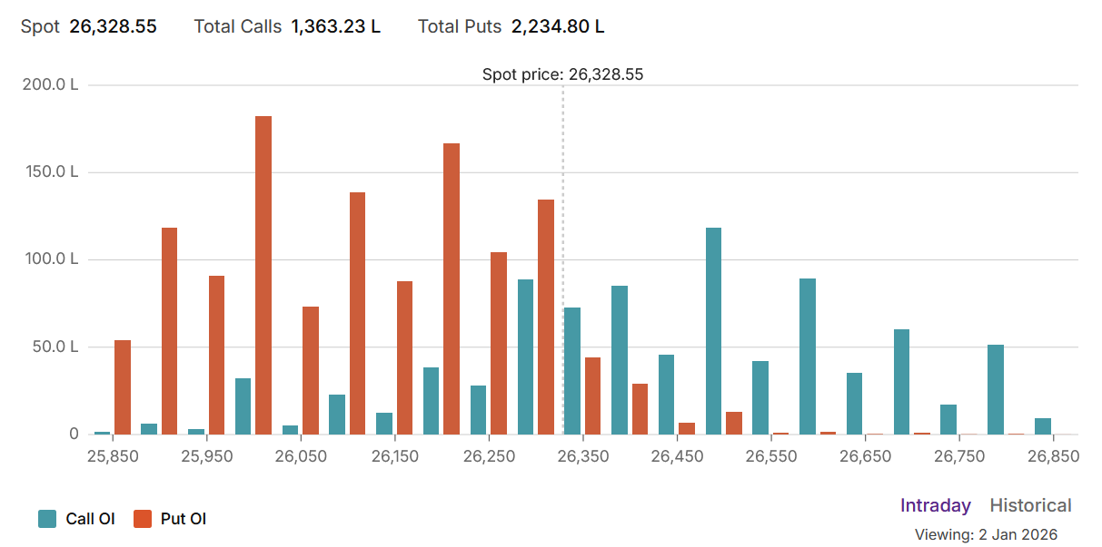 Support: The 26,300 Max Pain level has now flipped to become the immediate support pivot. Below this, a very strong support floor has been built at 26,200 and 26,000.