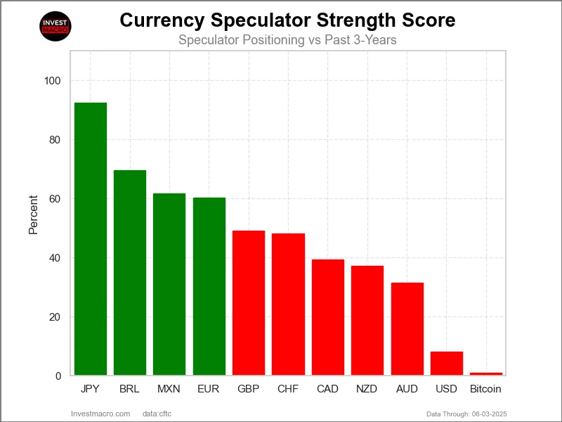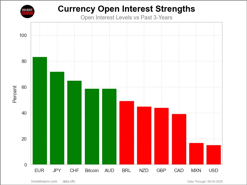 On the downside, the Bitcoin (1 percent) and the US Dollar Index (8 percent) come in at the lowest strength levels currently and are in Extreme-Bearish territory (below 20 percent). The next lowest strength scores are the Australian Dollar (31 percent) and the New Zealand Dollar (37 percent).