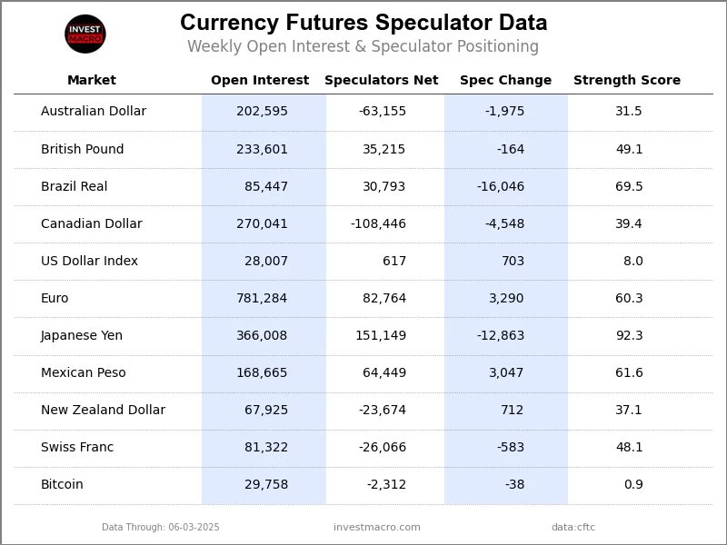 Legend: Open Interest | Speculators Current Net Position | Weekly Specs Change | Specs Strength Score compared to last 3-Years (0-100 range)