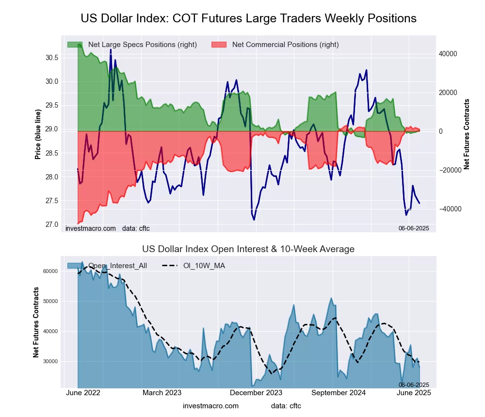 The US Dollar Index large speculator standing this week equaled a net position of 617 contracts in the data reported through Tuesday. This was a weekly lift of 703 contracts from the previous week which had a total of -86 net contracts.