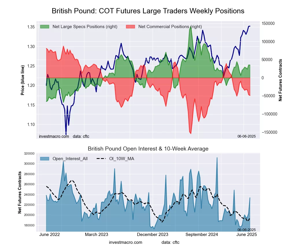 The British Pound Sterling large speculator standing this week equaled a net position of 35,215 contracts in the data reported through Tuesday. This was a weekly decrease of -164 contracts from the previous week which had a total of 35,379 net contracts.