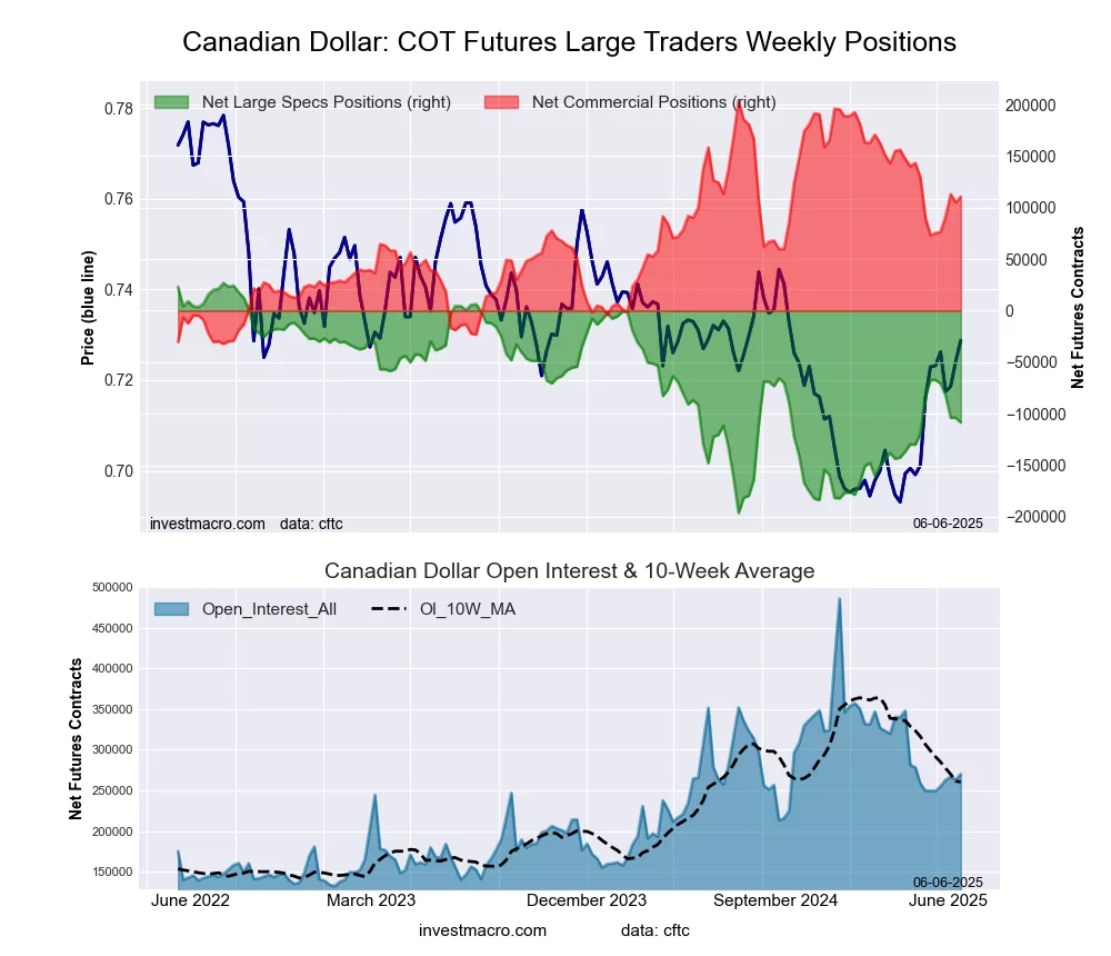 The Canadian Dollar large speculator standing this week equaled a net position of -108,446 contracts in the data reported through Tuesday. This was a weekly decrease of -4,548 contracts from the previous week which had a total of -103,898 net contracts.