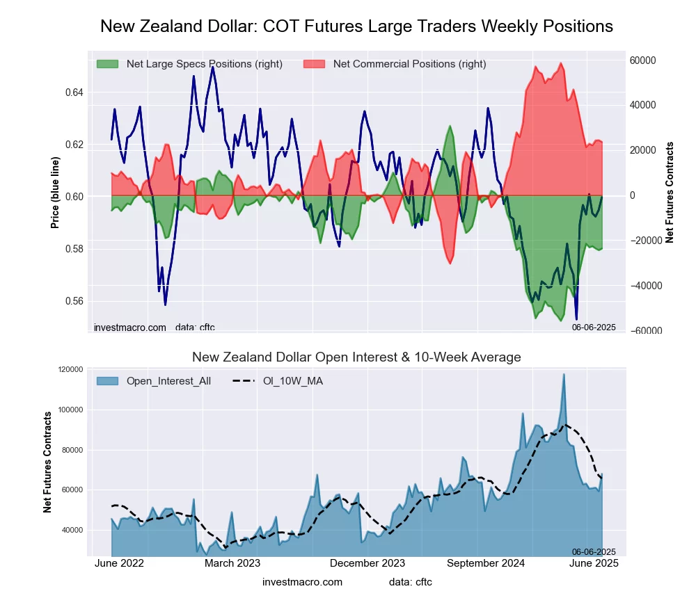 The New Zealand Dollar large speculator standing this week equaled a net position of -23,674 contracts in the data reported through Tuesday. This was a weekly gain of 712 contracts from the previous week which had a total of -24,386 net contracts.
