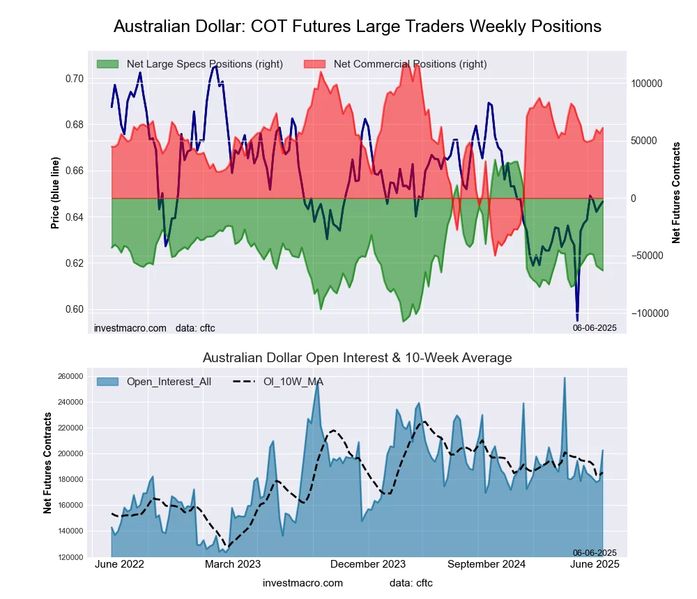 The Australian Dollar large speculator standing this week equaled a net position of -63,155 contracts in the data reported through Tuesday. This was a weekly decline of -1,975 contracts from the previous week which had a total of -61,180 net contracts.