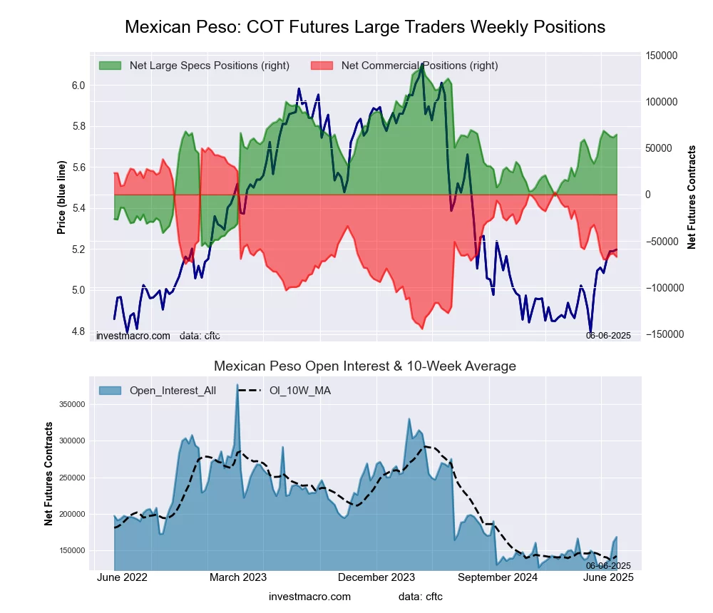 The Mexican Peso large speculator standing this week equaled a net position of 64,449 contracts in the data reported through Tuesday. This was a weekly advance of 3,047 contracts from the previous week which had a total of 61,402 net contracts.