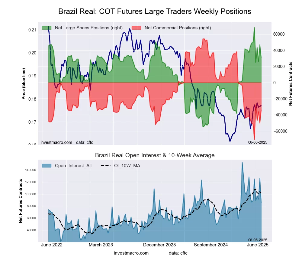 The Brazilian Real large speculator standing this week equaled a net position of 30,793 contracts in the data reported through Tuesday. This was a weekly lowering of -16,046 contracts from the previous week which had a total of 46,839 net contracts.