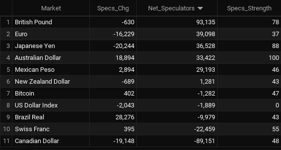 Legend: Weekly Speculators Change | Speculators Current Net Position | Speculators Strength Score compared to last 3-Years (0-100 range)